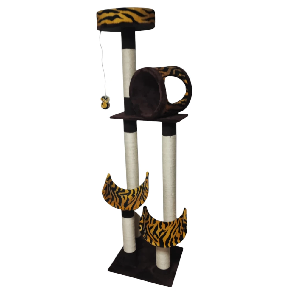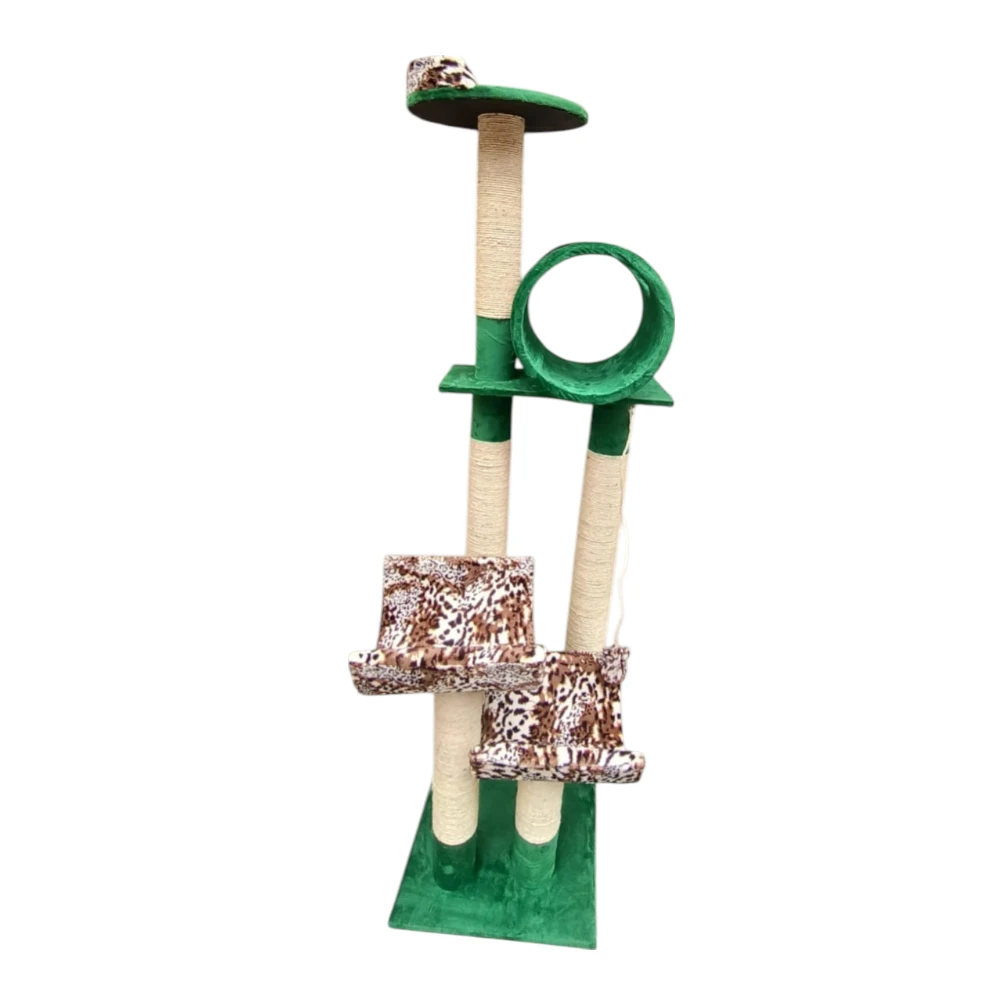 El gimnasio rascador para gatos se compone de 4 niveles, bases de 45 x 40 con 5 tubos de rascado y tunel grande, corona y 2 cunas. Se elabora en variedad de tonos